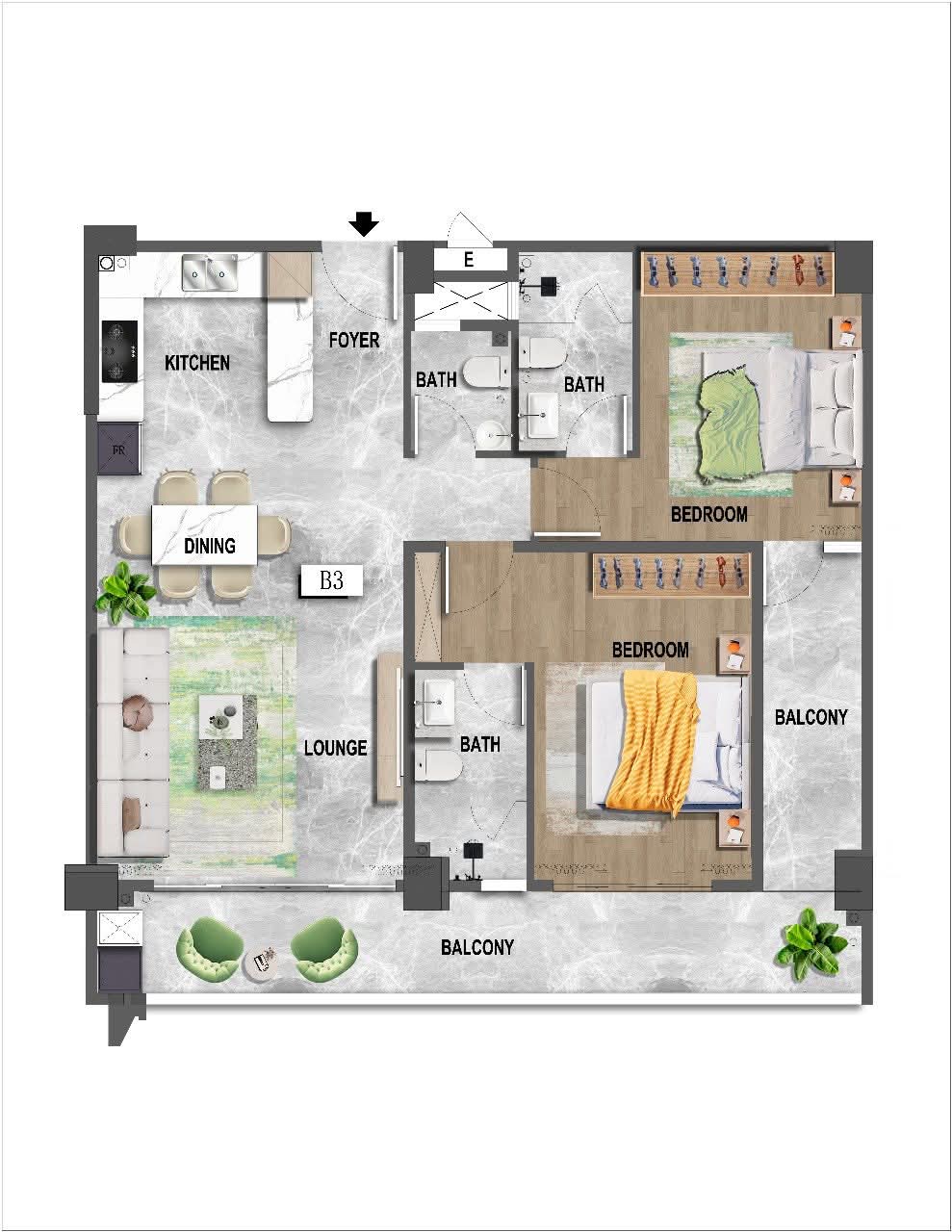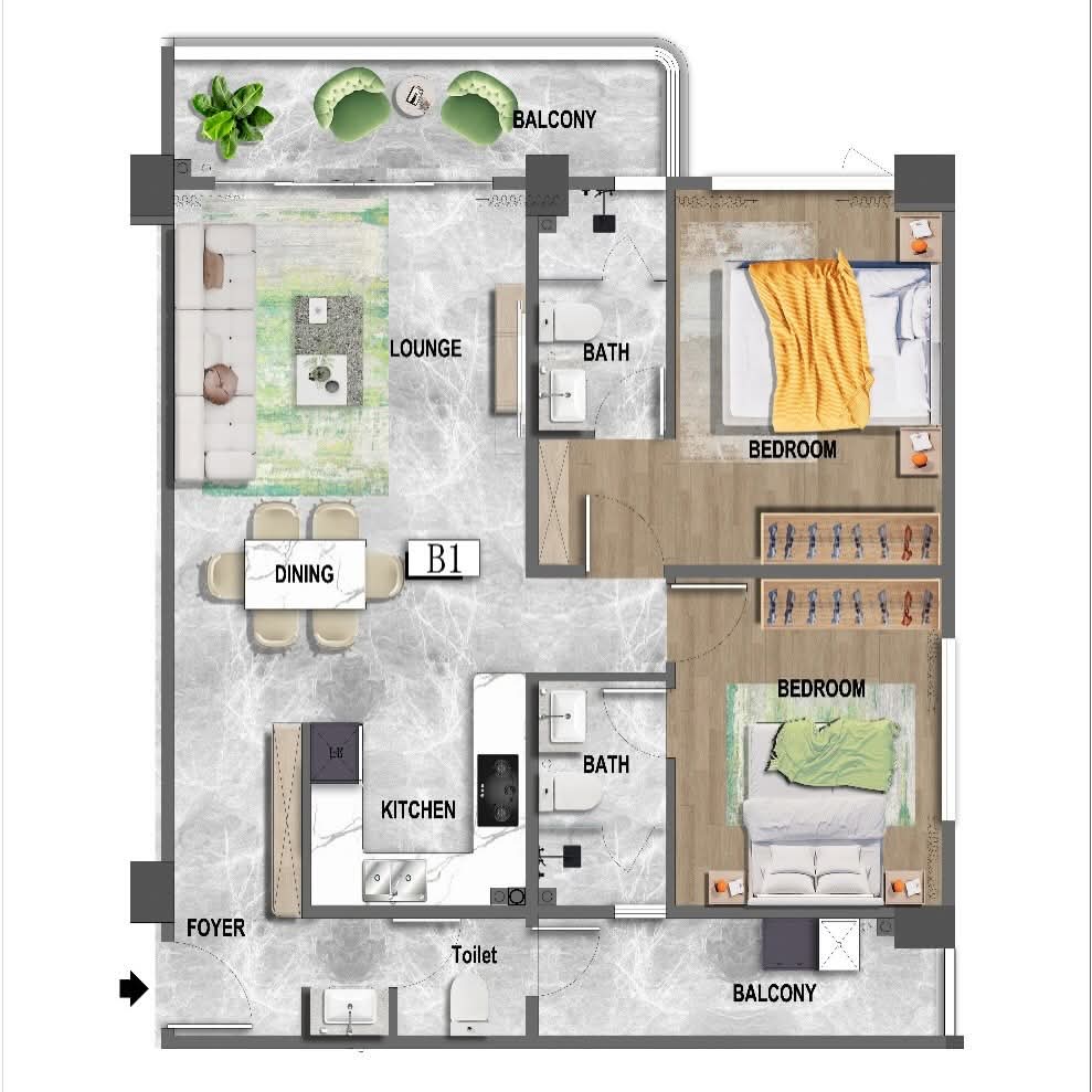 Unit Size (sqm) Price Range (KES) C1 61 7.3M – 7.93M C2 60 7.2M – 7.8M C3 66 7.9M – 8.58M C4 73 8.7M – 9.49M C5 75 9M – 9.75M C6 81 7.9M – 8.5M 2 Bedroom Apartments (Riverside / Westlands Border)